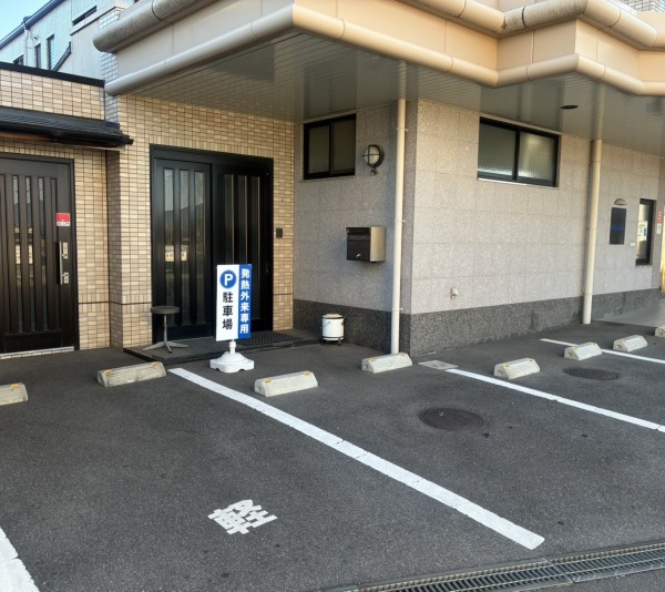 医院前に発熱専用駐車スペースを設けました。院内隔離スペースが使用されている場合、写真の場所でお車で待機いただきますようご協力いただきましたら幸いです。よろしくお願いいたします。